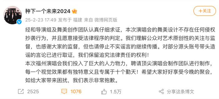 经和导演组及舞美创作团队认真仔细求证,本次演唱会的舞美设计不存在任何侵权抄袭行为,并且愿意接受法律程序的判定。我们理解公众对艺术原创性的关注与监督,也感谢大家的监督,但也请停止不实谣言的继续传播。对部分源头账号带头造谣的言论已进行取证,我们保留追究法律责任的权利!